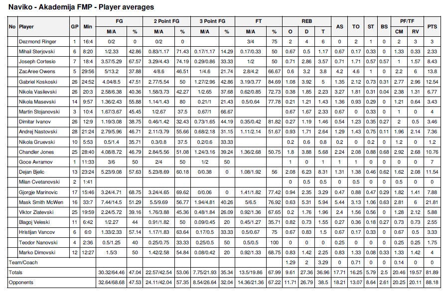 Дејан Бјелиќ со 8.3 скокови, е најдобриот скокач во тимот кој го водеше Тони Симиќ, додека пак во улогата на најдобар додавач е Маск Смит Мексвејн со 5.4 асистенции по натпревар.