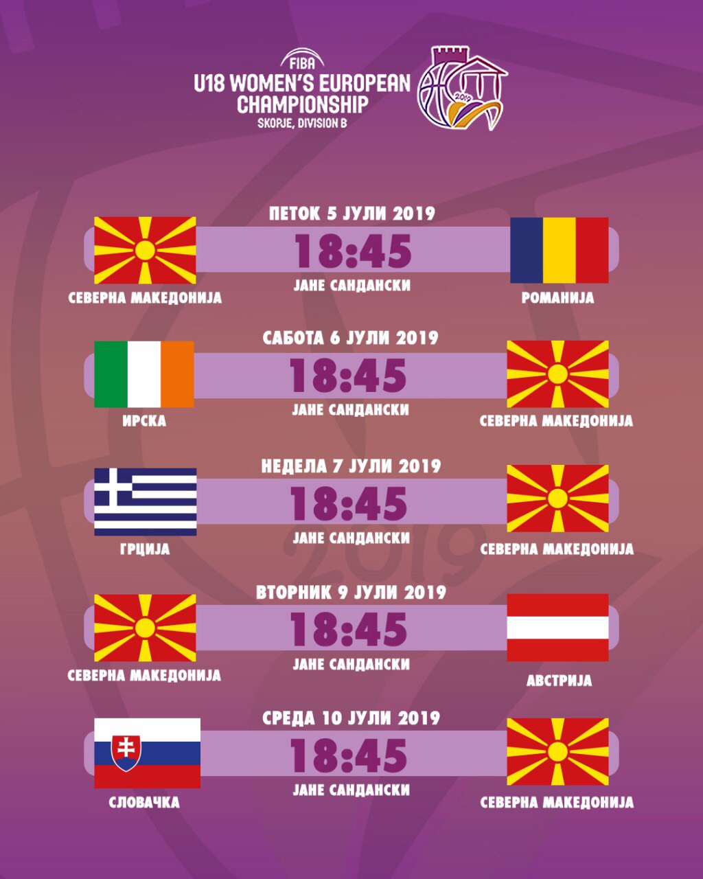 Нашите репрезентативки натпреварите од групната фаза ќе ги одиграат во малата сала при спортскиот центар „Јане Сандански“. Сите натпревари се одигруваат во термино од 18:45. Влезот во салата е бесплатен за сите оние кои сакаат да им бидат ветер во грб на нашите млади кошаркарки и да им дадат дополнителна поддршка од трибините.